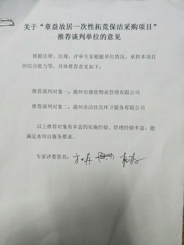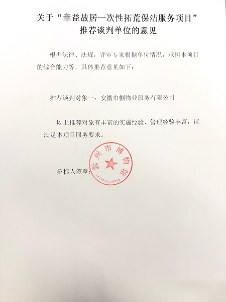 我单位对 章益故居一次性拓荒保洁服务项目 的竞争性谈判文件进行确认。 招标单位:滁州市博物馆 委托代理人:王静 联系电话: 0550-3038962 (单位盖章) 2020年5月 |